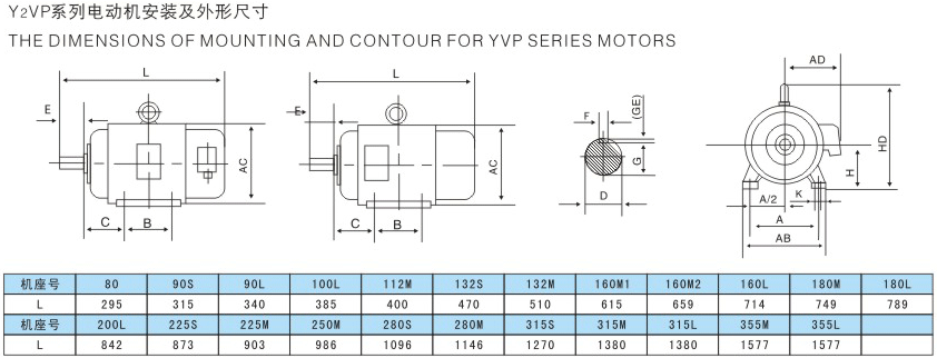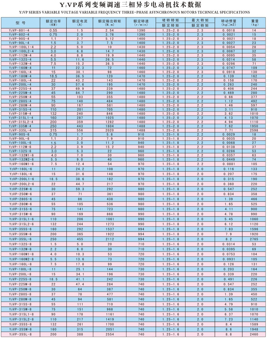 Y2VP系列電動機效率高,調速范圍廣,精度高,運行穩定,操作和維修方便,其安裝尺寸符合國際電工委員會(IEC)標準,外殼防護等級為IP54、IP55,定額是以連續工作制(S1)為基準的連續定額。也可以運行在S3、S4、S5工作制下。其基準結構及暗轉型式為B3、B5。YBP-160M1及以下機座號電機為自扇冷,Y2VP-160M2及以上機座號電機有外扇冷風機。Y2VP系列電動機的額定電壓為380V。額定頻率為50HZ,可以在3~100HZ范圍內連續調速,3~50HZ為恒轉矩運行,50~100HZ為恒功率運行。電機采用F級絕緣。Y2VP系列電動機適用于驅動軋鋼、起重、運輸、機床、印染、造紙、化工、紡織、制藥等要求連續和頻繁正反轉的各種機械設備上。可與國內外各種變頻電源配套使用。